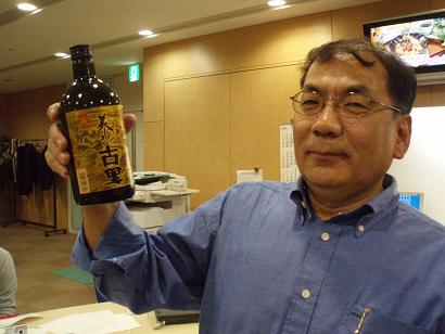 「美しき古里」という泡盛をおみやげにもらって喜びを隠しきれない白井さん。