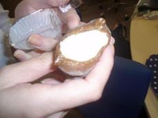 コーヒー風味の大福餅の中には、ふわっふわ、トロトロのティラミスが!! あまりにやわらかくふわふわ過ぎて、手で持つのに苦労するほどでした。