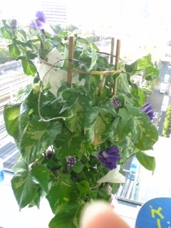 アナウンス部の窓際のアサガオの向こうも曇り空…